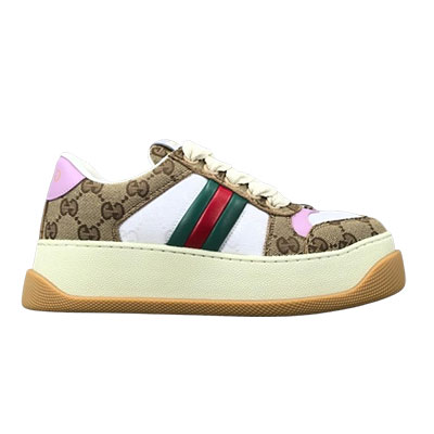 **구찌 스크리너 스니커즈 베이지 핑크 (817287 FAD7O 9751)**는 1970년대 빈티지 러닝화에서 영감을 받은 실루엣과 디테일에 구찌의 시그니처 GG 슈프림 캔버스 및 핑크 컬러 디테일을 더한 여성용 프리미엄 스니커즈입니다.