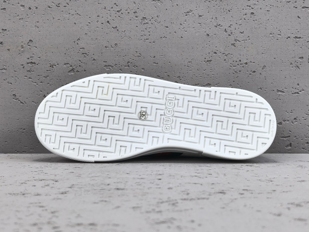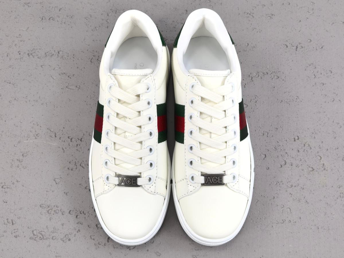 깔끔한 화이트 컬러를 베이스로 측면에 구찌의 상징인 그린과 레드 컬러의 웹 스트라이프가 배치되어 브랜드 아이덴티티를 강조합니다.