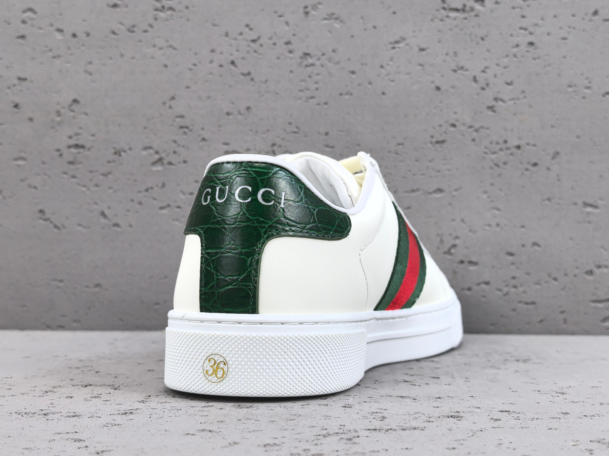 클래식한 화이트 컬러 베이스에 구찌의 시그니처 그린과 레드 웹 스트라이프가 측면에 장식되어 있습니다.