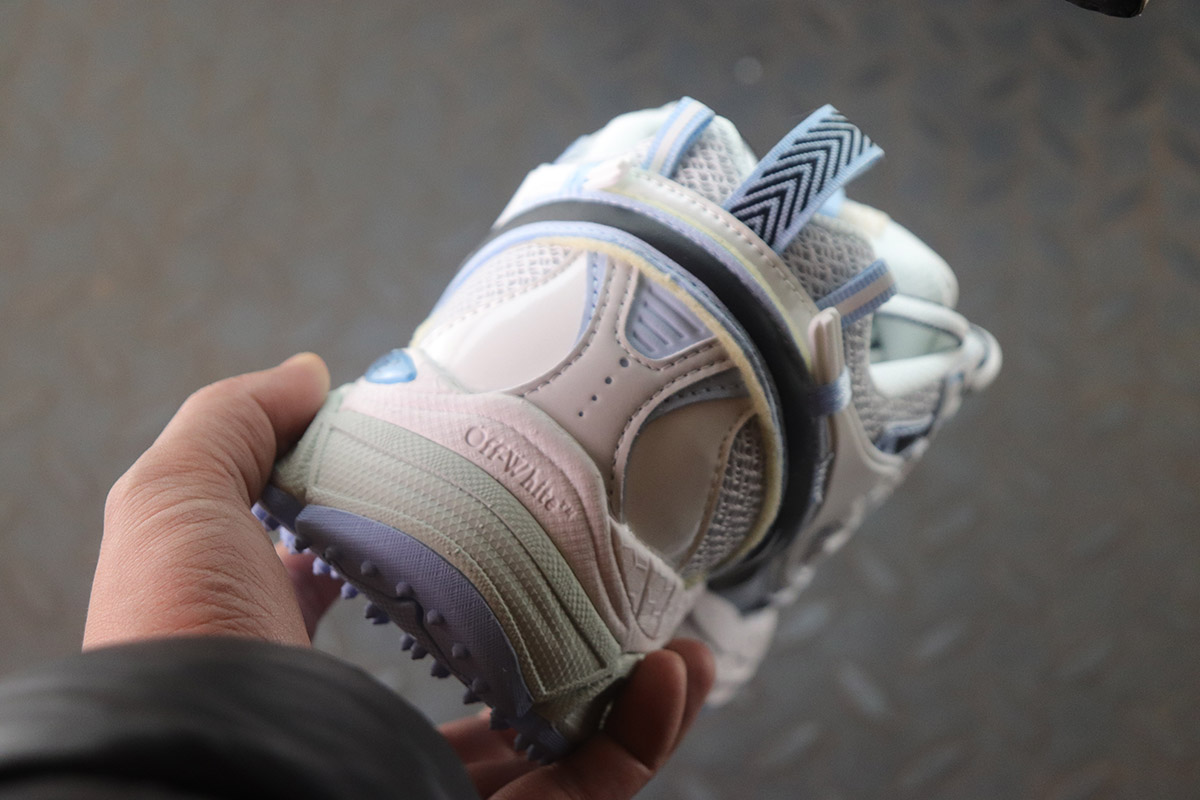오프 화이트 특유의 아이코닉한 디테일과 브랜드 로고가 돋보이며,