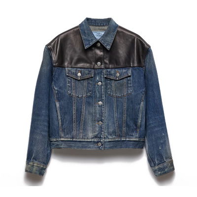 프라다의 레더 디테일 데님 자켓은 모던한 감각을 담았습니다.