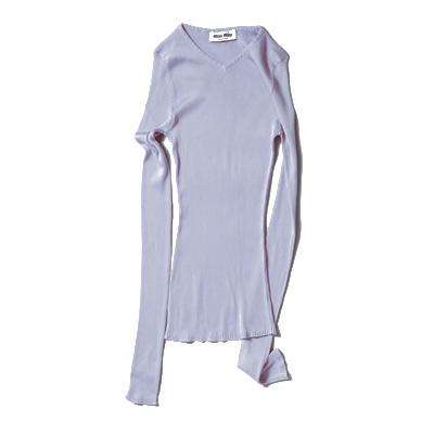 미우미우의 실크 브이넥 스웨터는 우아한 광택과 부드러운 촉감이 돋보입니다.