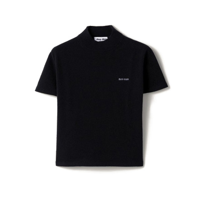 미우미우의 로고 캐시미어 반목 반팔 니트 스웨터는 고급스러운 질감과 세련된 디자인이 돋보입니다.