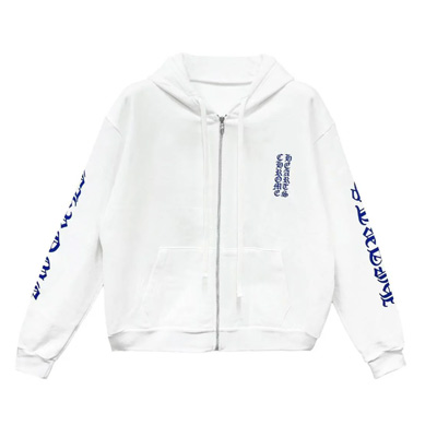 크롬하츠 블루 스크롤 화이트 집업 후드티는 브랜드 특유의 대담한 그래픽 감성과 스트릿 감성이 결합된 아이코닉 아이템입니다.