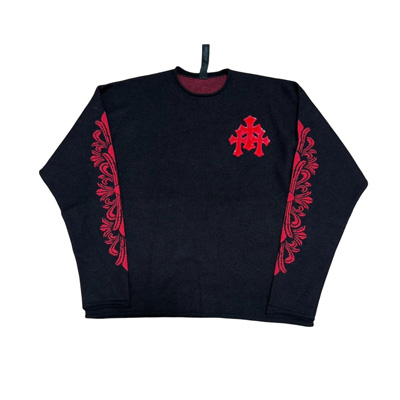 크롬하츠의 아이코닉한 감성이 담긴 레드 가죽 크로스 패치 캐시미어 스웨터입니다.