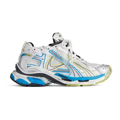 발렌시아가 러너 스니커즈 화이트 옐로우 블루는 빈티지 러닝화에서 영감을 얻은 해체적 디자인이 특징입니다.
