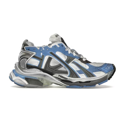 발렌시아가 러너 스니커즈 블루 화이트 그레이는 빈티지 러닝화에서 영감을 받은 해체적 디자인이 특징입니다.