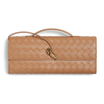 보테가베네타의 시그니처 위빙 패턴이 적용된 안디아모 클러치입니다.