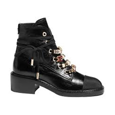 샤넬의 아이코닉한 블랙 진주 컴뱃 부츠입니다.
