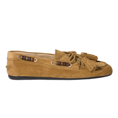고급 스웨이드 소재로 제작된 미우미우 태슬 로퍼입니다.