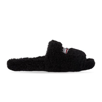 부드러운 퍼 소재로 제작된 퍼리 슬라이드 샌들입니다.