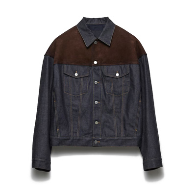 데님과 스웨이드가 결합된 프라다의 하이브리드 블루종입니다.