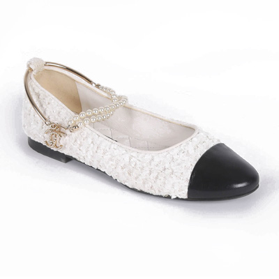 트위드 소재의 샤넬 스트랩 플랫슈즈 디자인입니다.