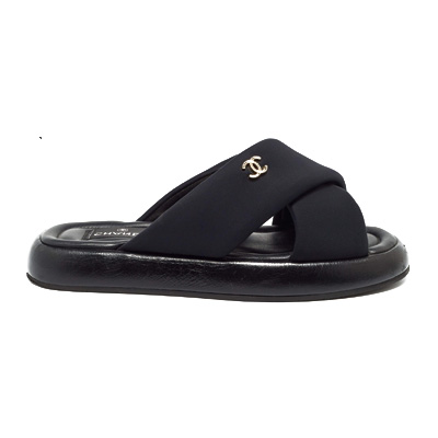 샤넬 CC 퍼프 새틴 가죽 크로스 슬라이드 플랫 블랙
