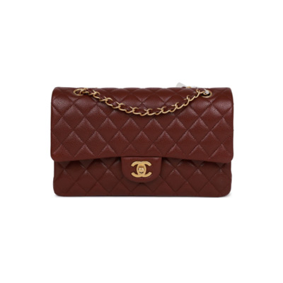 샤넬 클래식 미디엄 더블 플랩 캐비어 체인 숄더백 버건디 앤틱 골드 A01112