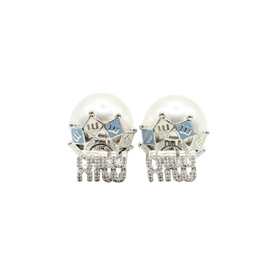 미우 미우 로고 펄 지르코니아 메탈 귀걸이 실버 화이트 블루